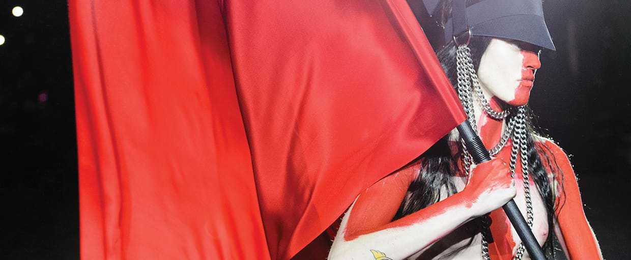 O outono/inverno 2015 viu um retorno bem-vindo à agenda da semana de moda de Londres – Gareth Pugh, de volta à sua cidade natal pela primeira vez desde 2008. O desfile não decepcionou e veio com o novo sentido característico de Pugh de drama e misticismo. As modelos eram guerreiras em figurinos inspirados na Grã Bretanha, prontas para a batalha, paramentadas de chapéus da Guarda Real e capacetes moicanos. A ode à história antiga da Grã Bretanha foi completada por um look de maquiagem forte de Alex Box – cada garota tinha a cruz de São Jorge pintada no rosto. O resultado?