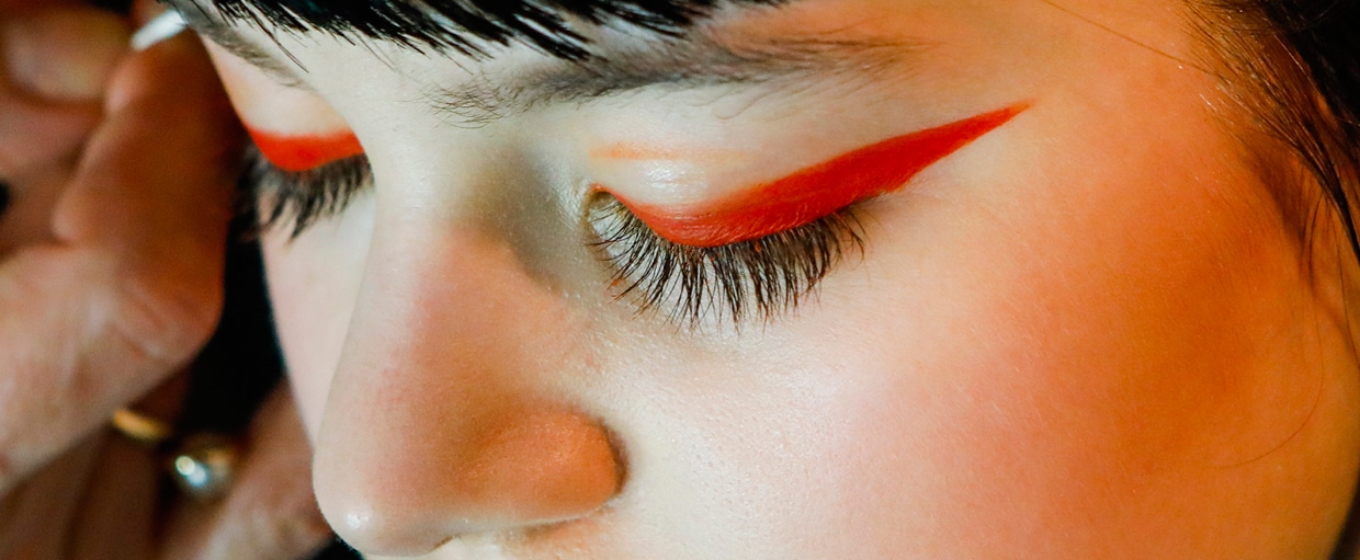 Dowsett: Nós experimentamos com várias combinações de vermelho e azul, mas descobrimos que o vermelho era um tom muito forte para os olhos. Laranja era o mais amigável e nos lembrava o mosaico de Gaudi que inspirou os designers. Escolhemos um delineador gráfico com grande significado, com uma linha de kohl branca. Algumas meninas usavam uma combinação de cores laranja e vermelho; outras usavam azul- marinho e azul-escuro. Os meninos simplesmente levavam máscara para cílios na cor azul-marinho nas sobrancelhas, com um toque de corretivo e hidratante.