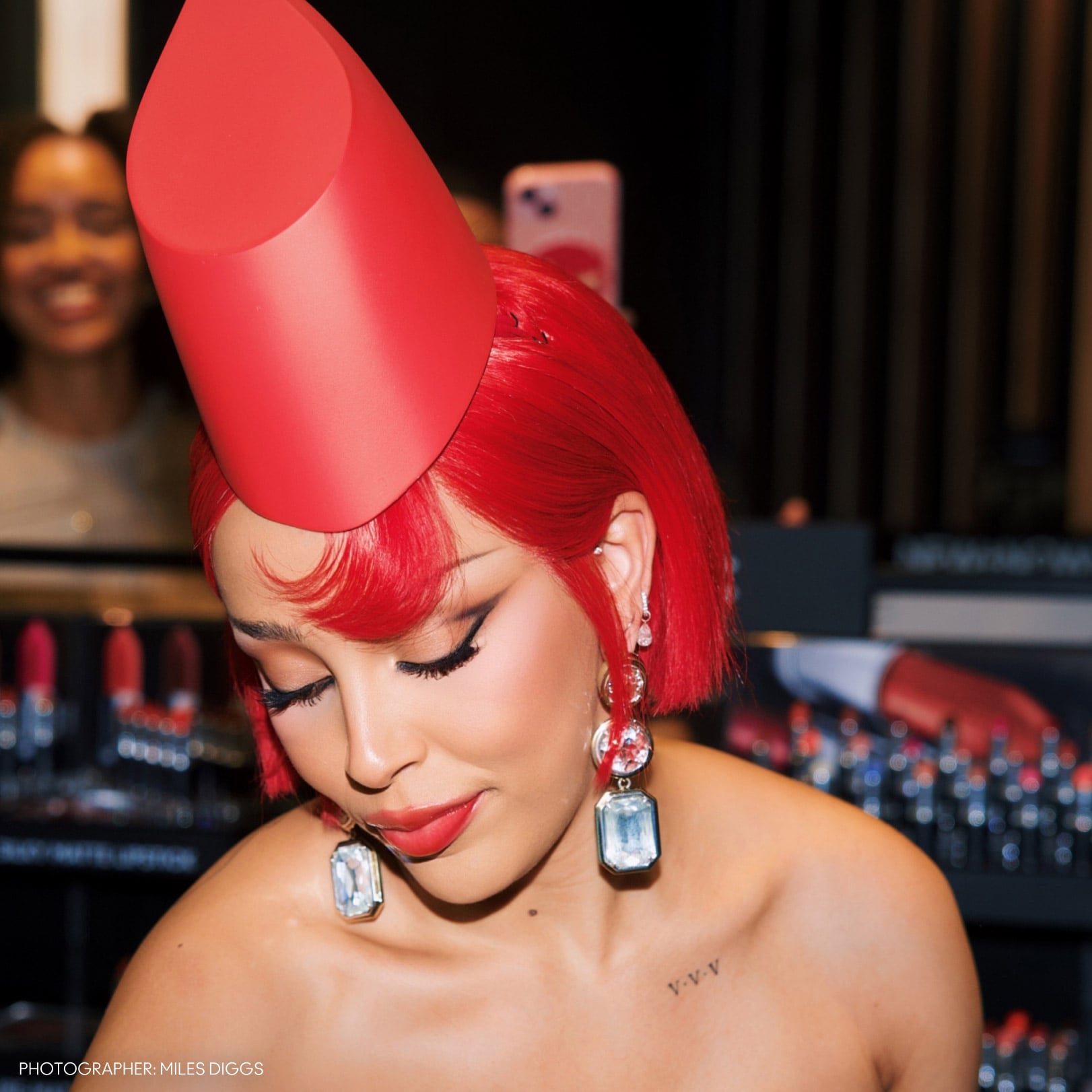 Doja Cat levou o conceito de “Eu só uso M·A·C” a outro nível ao aparecer no “M·A·C Match Day” vestida como um Lady Danger em tamanho real, sim, o batom icônico! Ela encontrou fãs no Glendale Galleria, na Califórnia, em um look que foi praticamente uma obra de arte viva.